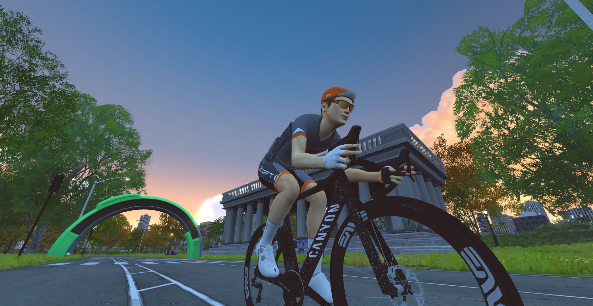 Happily, my computer already had the latest Zwift update installed, plus it boots up fast. I changed my in-game kit to Coalition’s, changed my name so it included my pull number (I was rider #6) and team name, switched to the Cadex Tri bike with DT Swiss 85/Disc wheels, and joined the pens with around 4 minutes to go. It was a good thing we were the 7th team to start (at 10:07) instead of the first (at 10)!