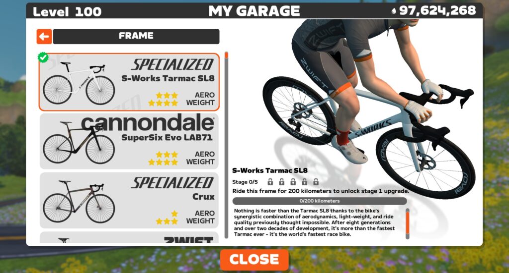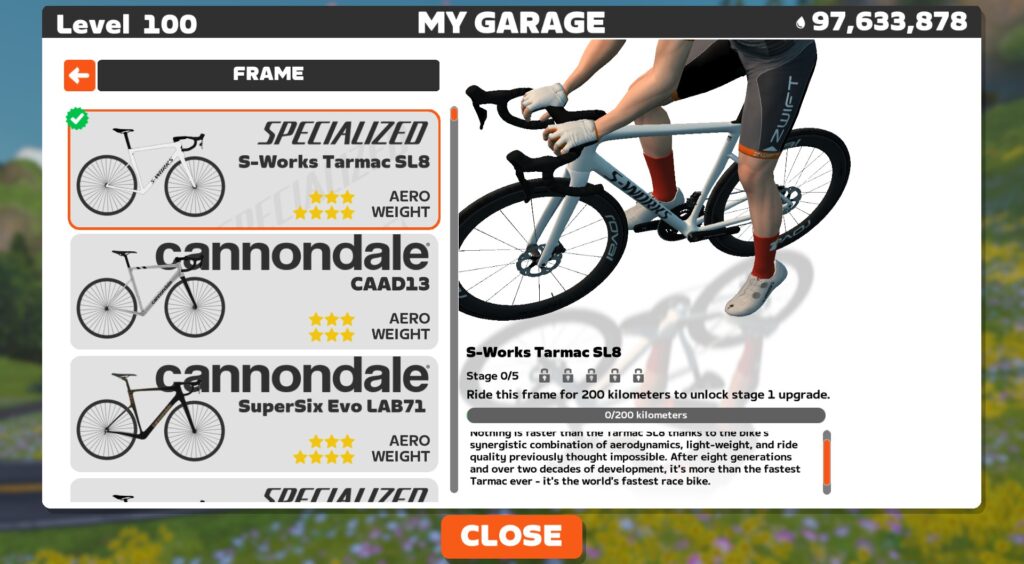 If you pull up your bike in your garage, you can quickly figure out which category it is in based on what the game tells you to do to unlock stage 1. In my S-Works Tarmac SL8 example above, you can see it’s telling me to ride 200 kilometers, which means this frame is in the “Distance” category. (Where almost all road bike frames live, by the way.)