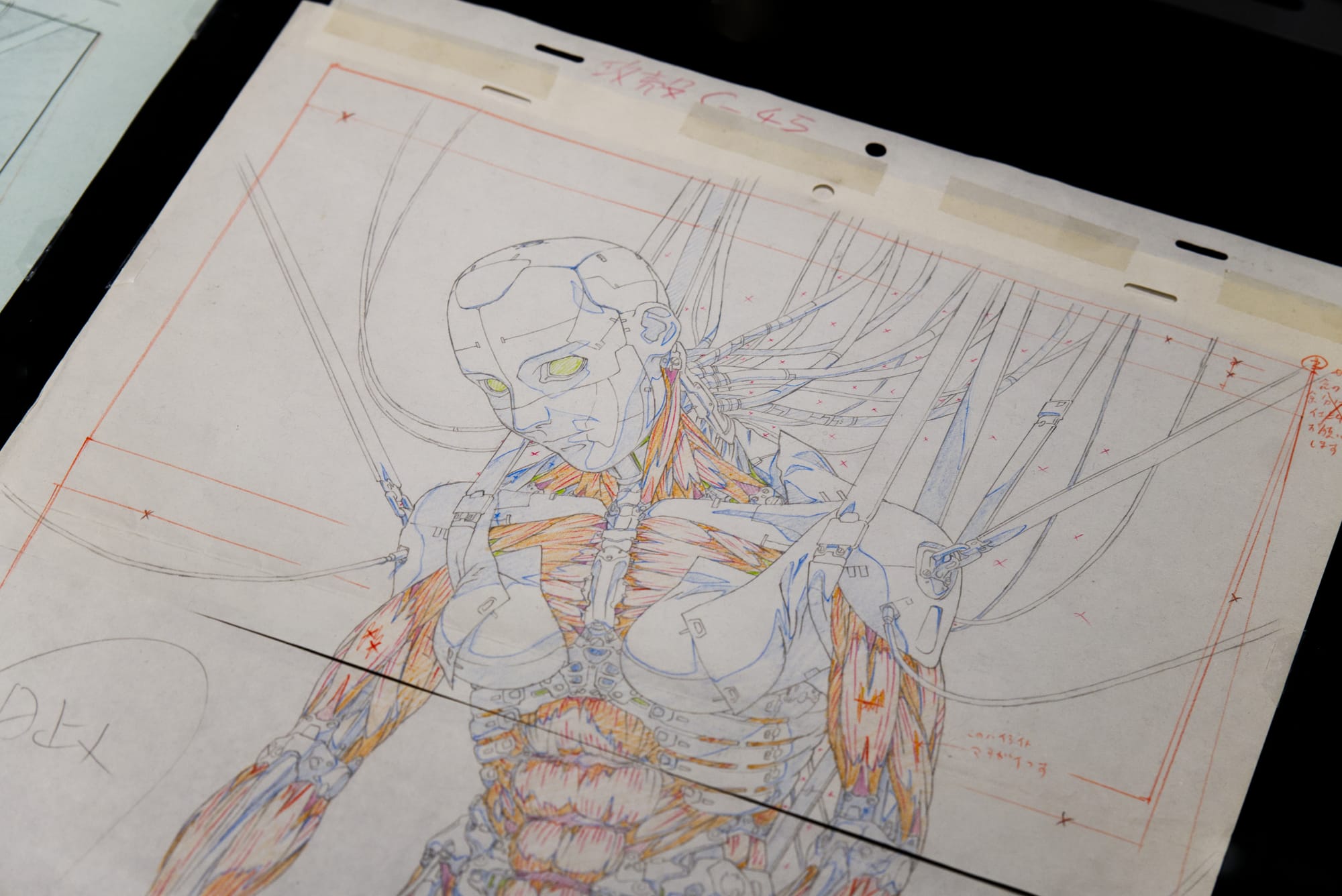 Conceptually, this is the first deep dive into the history of the entire franchise in a single exhibition, showcasing materials used in the production of not just early works but every series and film from the 1995 original all the way until the more recent Netflix-produced CG works, Arise, and an all-new preview for the all-new series from Science Saru premiering later this year. As such, original cels, storyboards, sketches and production materials from every series were on display, alongside newly-produced artworks from a range of creatives that explore questions on humanity, AI, technology and the human body posed by the franchise. An analogue look at a technological world, as original paper sketches are framed on walls and in glass panels.