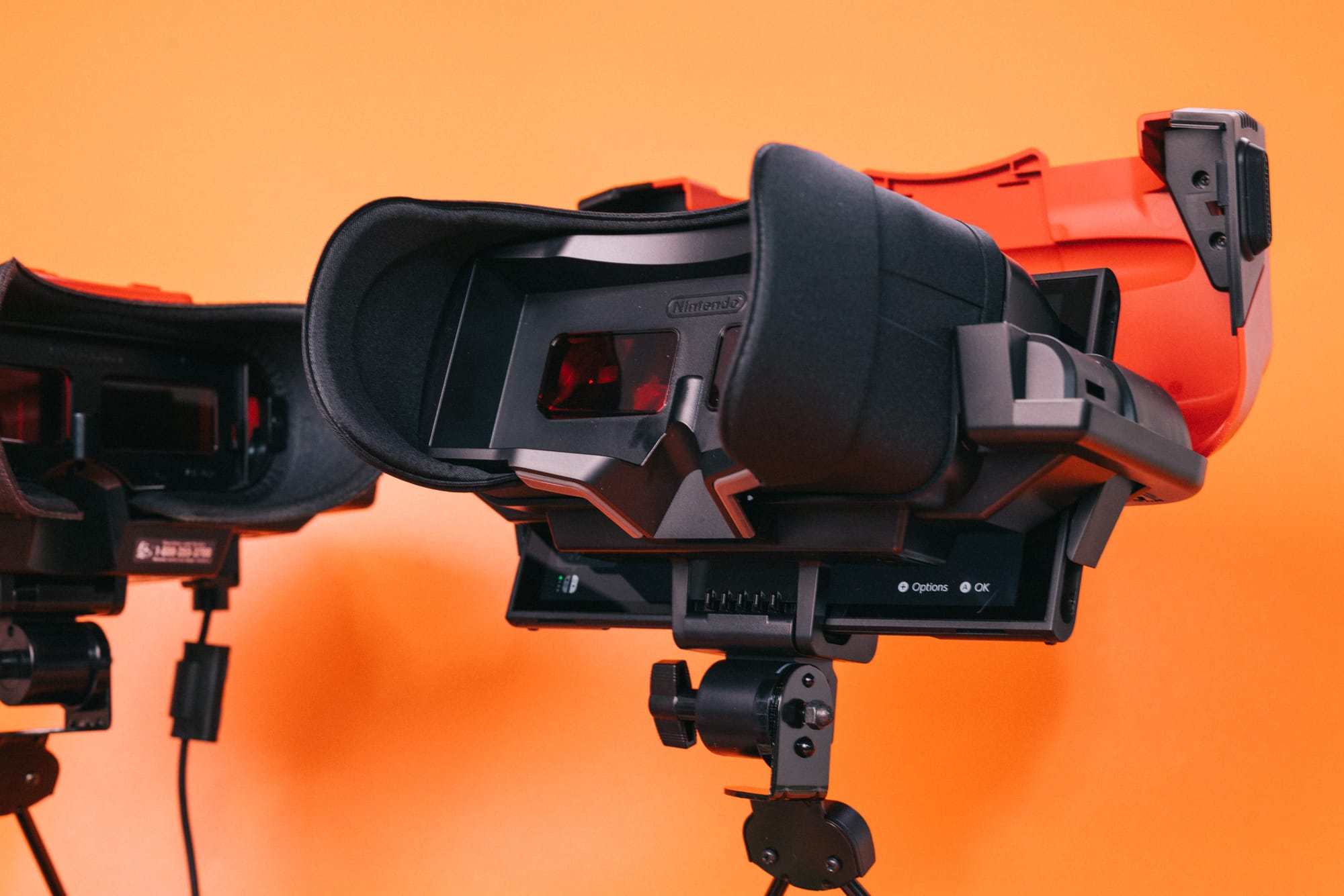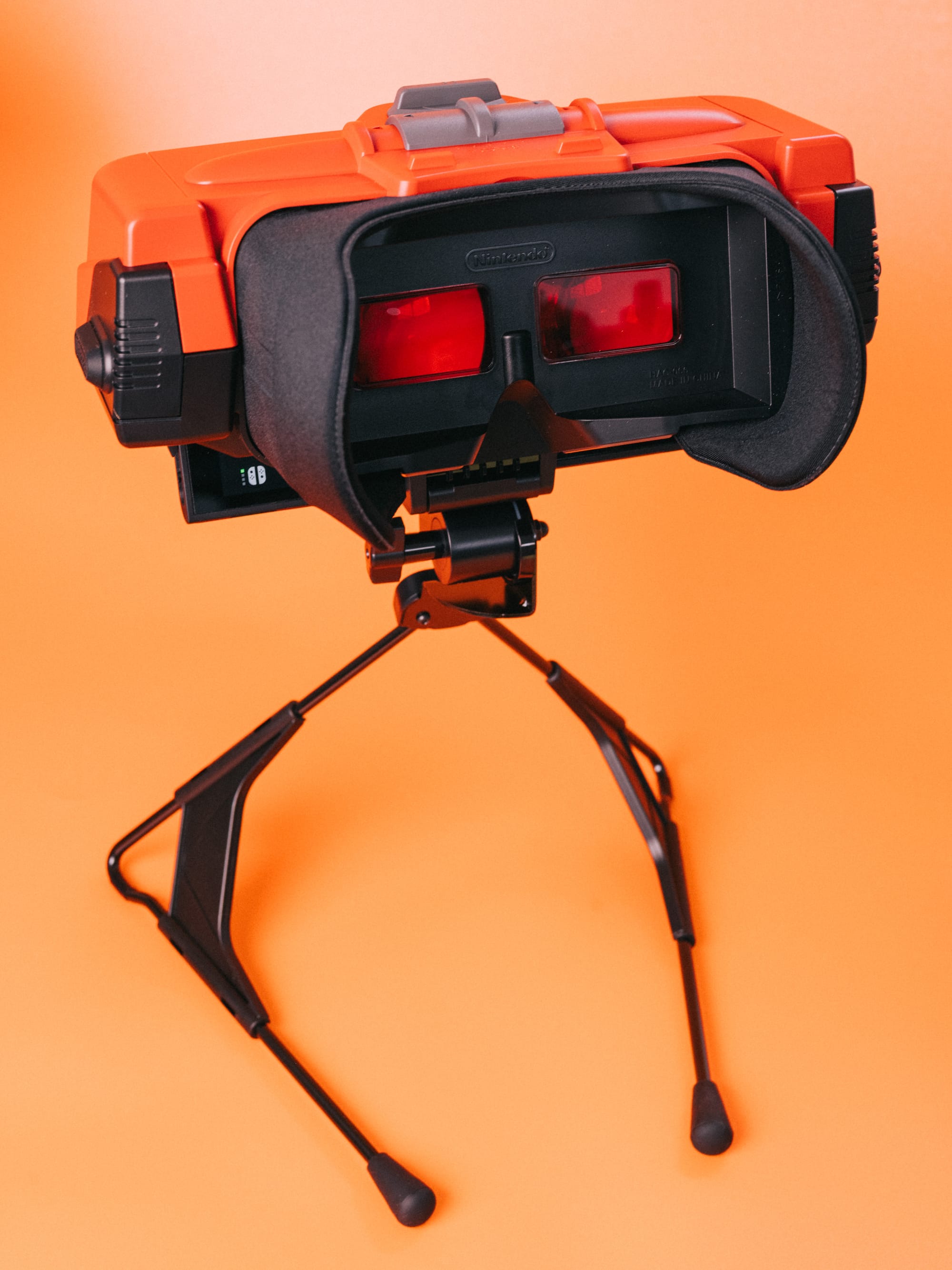 It’s true that the new Virtual Boy is slightly larger than the original, but then again, we need to slot a Switch or Switch 2 inside it. That naturally requires some extra space. That said, the small details are incredibly accurate. The rubber bumpers on the side of the unit, the rubber nubs at the end of the stand’s legs, the focus and IPD controls, the (fake) volume control and headphone jack and EXT. port, they’re all here and replicated perfectly. Even the stand’s adjustment mechanism utilizes a virtually identical acorn nut as the original.