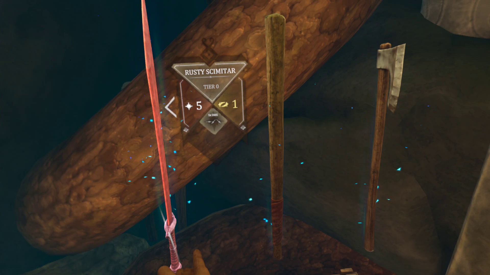 In Crossings, you awaken in the Norse afterlife, starting in a forest blanketed in fog with a choice of weapons to start your run with. Each weapon has a tier, damage stats, and special gesture-based combo attacks that offer a buff such as a damage multiplier or status ailment, if performed correctly. If you pick another weapon, it simply replaces the original. There is no full body avatar here, just hands and wrists, which are replaced with your weapon (primary hand) or item (secondary hand) when in use. The floating hands are nothing new to VR, but seeing them disappear in favor of an item was jarring and a bit immersion breaking.