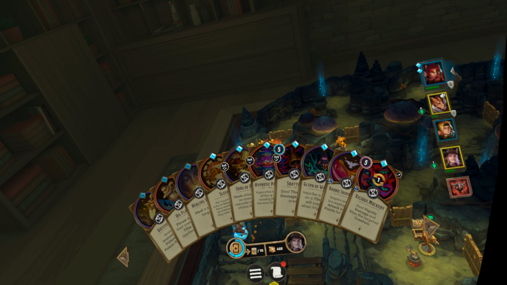 Battles remain challenging, though usually not overwhelmingly so like it could sometimes feel before. Enemies don’t spawn nearly as often in Demeo x D&D. You often need to find the way out or defeat the boss, collecting gold to buy new cards along the way from the local bazaar or after individual stages in longer dungeons. My co-op partner and our two hirelings – we each controlled one of these extra characters – only really struggled as we reached the first campaign’s end.
