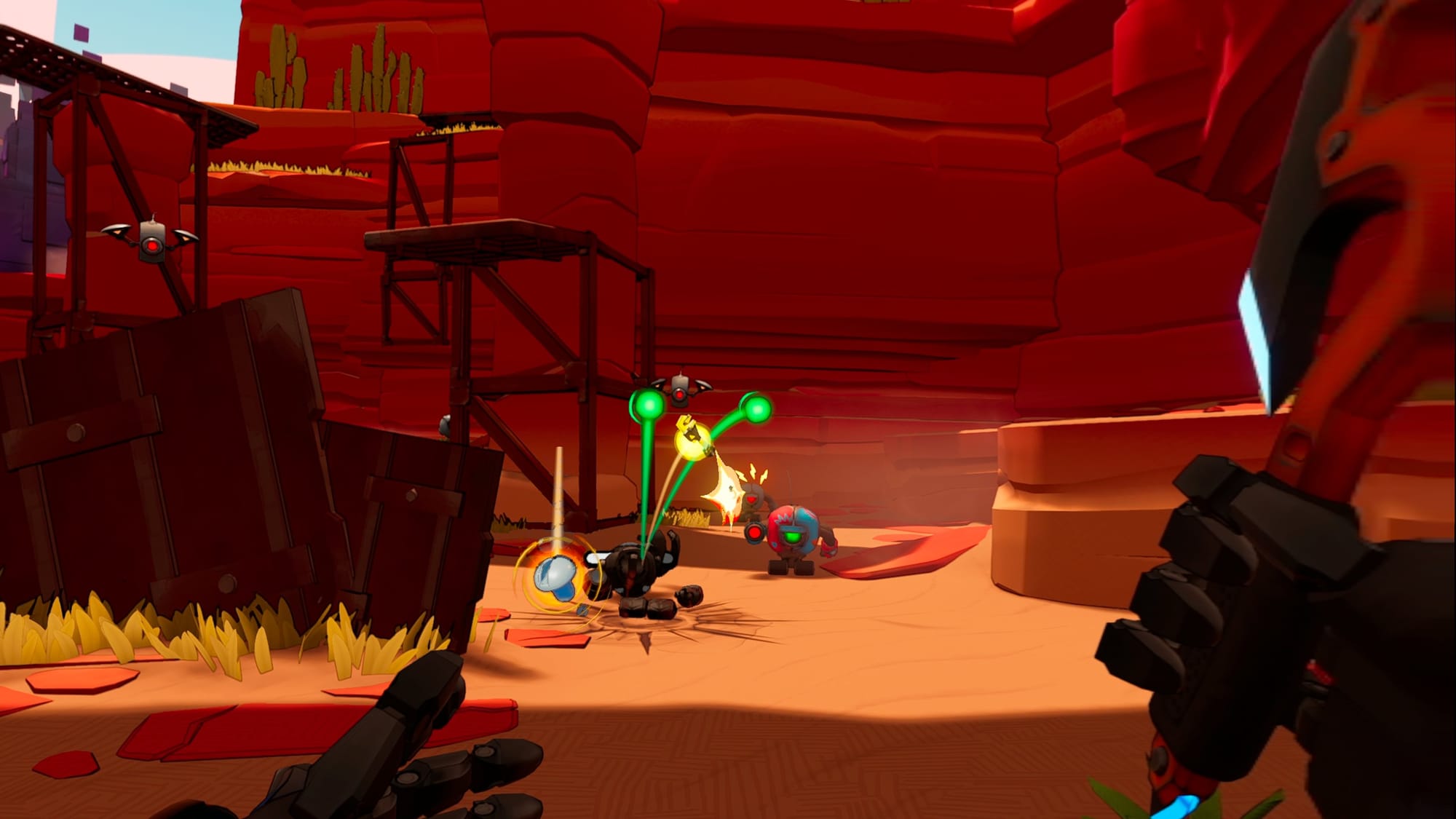 VR is no stranger to flatscreen conversions, and Flat2VR Studios quickly made a name for itself doing exactly that. Roboquest VR is the latest example, taking RyseUp Studios’ 2023 roguelite FPS and thoroughly overhauling it. You control a Guardian robot taking down waves of hostile enemy machines, blazing a path for your human companion Max towards Haven 8 – an oasis in the desert that makes up most of this post-apocalyptic Earth.