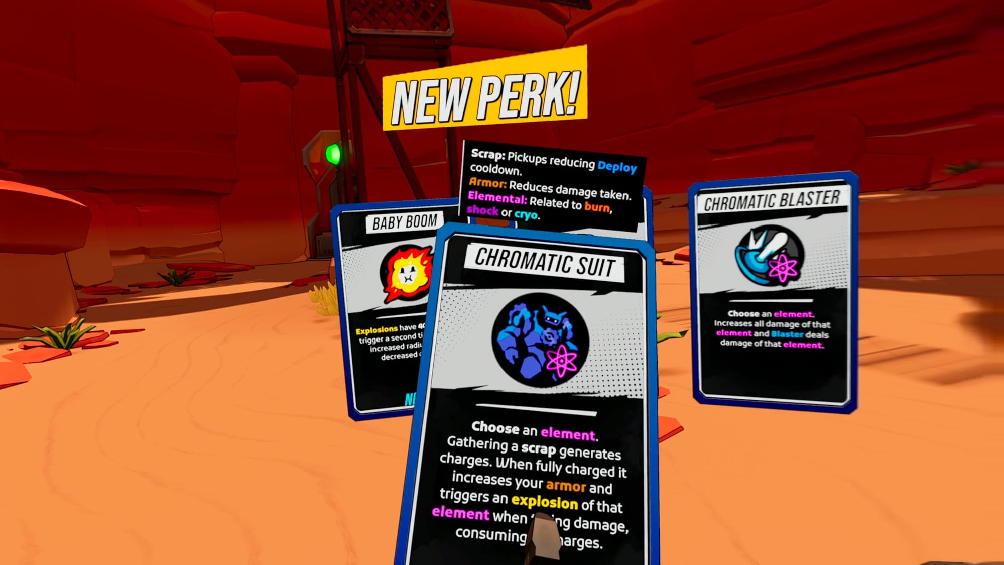 Other retooled elements relate to the user interface; while by default there’s a floating health bar for your convenience, you can check your left wrist for more granular information on your status, including HP and how close you are to leveling up. The right wrist can showcase a minimap when raised and can be expanded by holding down the right grip button. Upon level-up, the perks you’re offered are portrayed as physical cards that you must grab and then confirm your choice by holding down the trigger while the perk card is in your hand. All very welcome changes, and these go a long way towards grounding the VR experience.