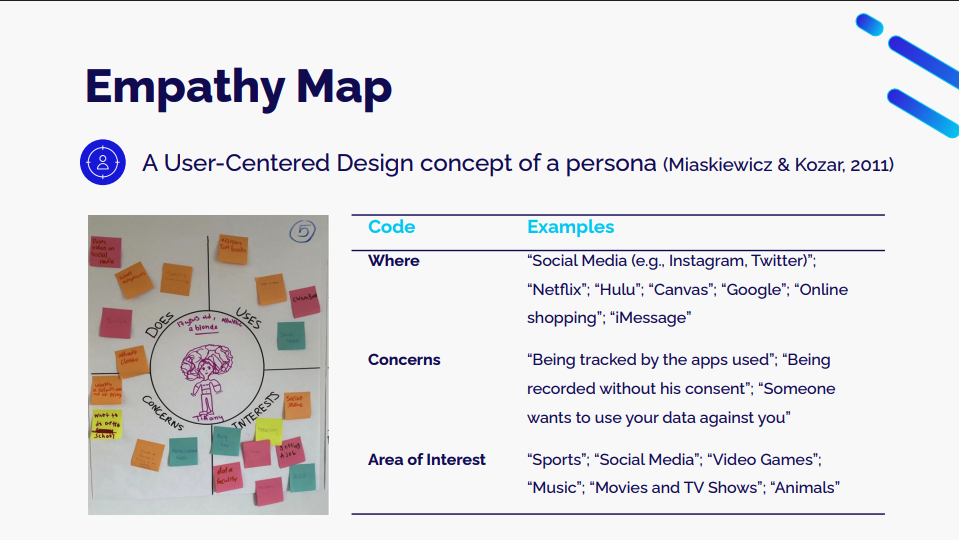 One activity, Empathy Map, involved students working together to create a persona representing a student in their school. They were asked to describe the persona’s daily life, interests, and concerns about technology and data: