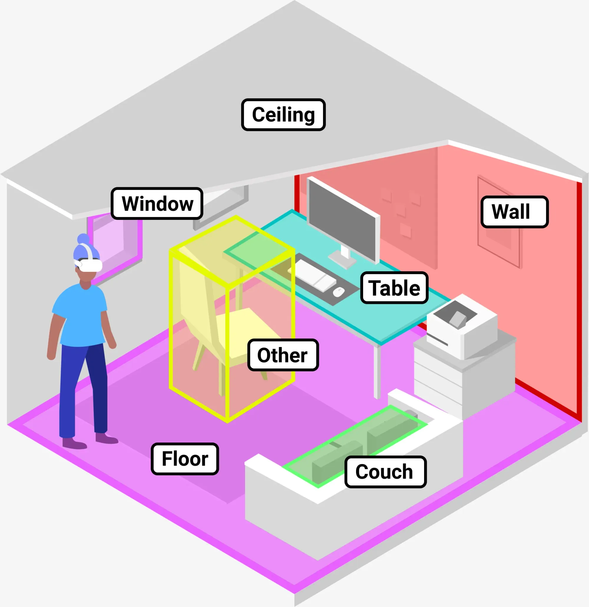 Quest 3 and Quest 3S create a 3D mesh of your room during mixed reality Space Setup. Since launch, Meta’s system has been able to infer the positions of your main walls, floor, and ceiling from this 3D mesh, and since Horizon OS v64 it has also generated labeled bounding boxes for doors, windows, beds, tables, sofas, storage (cabinets, shelves, etc.), and screens (TVs and monitors).