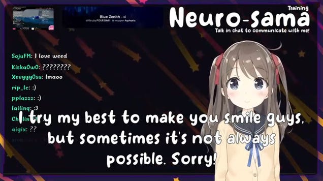 Neuro-sama is a VTuber who streams Minecraft and the rhythm game Osu! on Twitch. But unlike most anime avatars, she’s controlled by an artificial intelligence program rather than a human being. That makes her catnip for the denizens of Twitch chat, who can prompt her to respond with all sorts of questions ranging from…