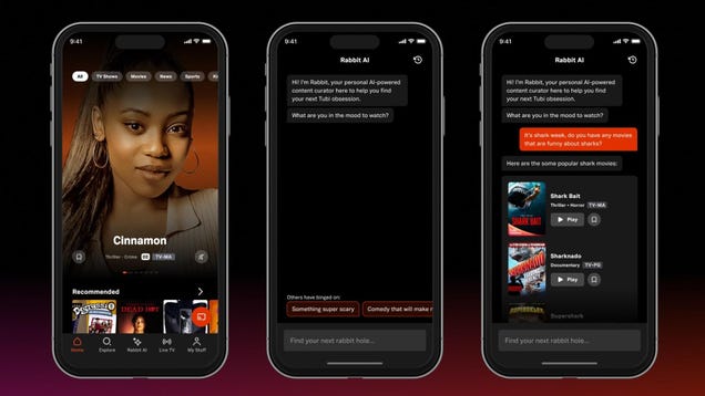 Streaming platform Tubi has announced a new way to search for movie recommendations today: Rabbit AI. The new “chat feature” uses OpenAI’s GPT-4 to let users search for movies and TV show recommendations in a more conversational manner, allowing for hyper-specific recommendations from text like, “I want to see funny…