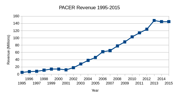 The PACER system has been on the Web since the late 1990s. To avoid using taxpayer funds to develop the system, Congress authorized the courts to charge users for it instead. Given the plunging cost of bandwidth and storage, you might have expected these fees to decline over time. Instead, the judiciary has actually raised fees over time—from 7 cents per page in 1998 to 10 cents per page today. Even search results incur fees. The result has been a massive windfall for the judiciary—$150 million in 2016 alone.