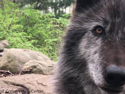 The howl of magnificent Zephyr at NY’s Wolf Conservation Center gets Mother Nature’s attention.
