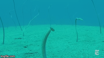 This is a short video episode of ScieneTake, produced by The New York Times, discussing the fascinating, albeit incredibly stationary, lives of garden eels. Are these what Ursula was turning all the merpeople into in The Little Mermaid? “Those were polyps.” I was about to say, those were definitely more terrifying looking than these little sea pencils. If you had to choose to be any animal in the ocean, what would you pick? “A shark!” Because I would choose to continue being me, standing knee deep in the surf on a tropical beach, piƱa colada in hand. “But–” I didn’t say you had to live in the ocean, Toothy.