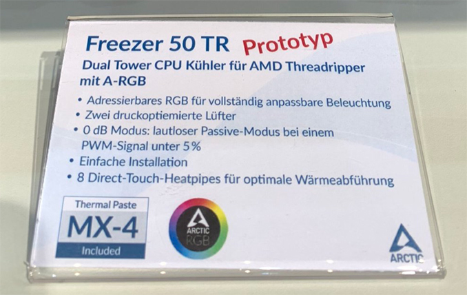 At an event for gamers in Leipzig, Germany, Arctic demonstrated a prototype of one the industry’s first partially-passive cooling systems for AMD’s Threadripper processors. The Freezer 50 TR is a sizable heatsink-fan cooler that is specifically designed to be able to cool a Threadripper processor passively under low loads, allowing its fans to be turned off to minimize noise. And while it looks extremely big and will be an interesting challenge in fit in most modern PC cases, having cooler that can run noise-free under light loads certainly comes with its advantages.