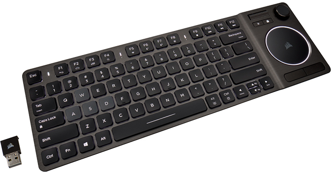 Corsair this month has rolled out its first keyboard designed primarily for HTPCs. The K83 Wireless Entertainment Keyboard incorporates a tenkeyless keyboard using Corsair’s low-profile switches, along with a touchpad, a joystick, and a dedicated volume scroller to to flesh out the functionality of Corsair’s lap-friendly keyboard.