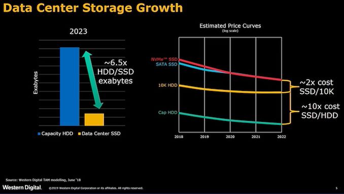 High-capacity hard drives are not going to be replaced by high-capacity SSDs any time soon, according to Western Digital. HDDs will continue to cost significantly less than SSDs on per-TB basis. Therefore, they will be used to store 6.5 times more data than datacenter SSDs in 2023.