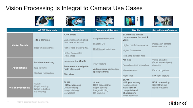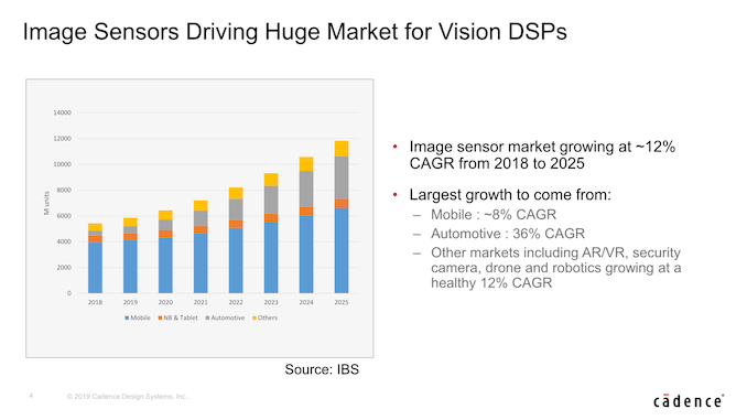 Over the next few years Cadence sees significant growth opportunity for the vision DSP market, with the overall image sensor market growing at a rate of ~12% CAGR till 2025. Naturally those image sensors will need corresponding image processing power behind them in order to transform the raw image data into something meaningful. Particularly the automotive sector is projected to boom enormously in this regard with a continuous annual 36% growth rate, thanks to the projected need for dozens of sensors in future cars.