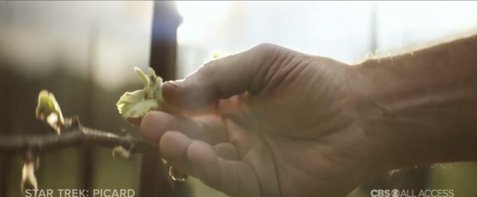 “Fifteen years ago today you led us out of the darkness,” a voiceover intones elliptically over a vineyard that evokes images of the potential future in Next Generation finale All Good Things…. “You commanded the greatest rescue armada in history. Then, the unimaginable. What did that cost you? Your faith? Your faith in us? Your faith in yourself?”