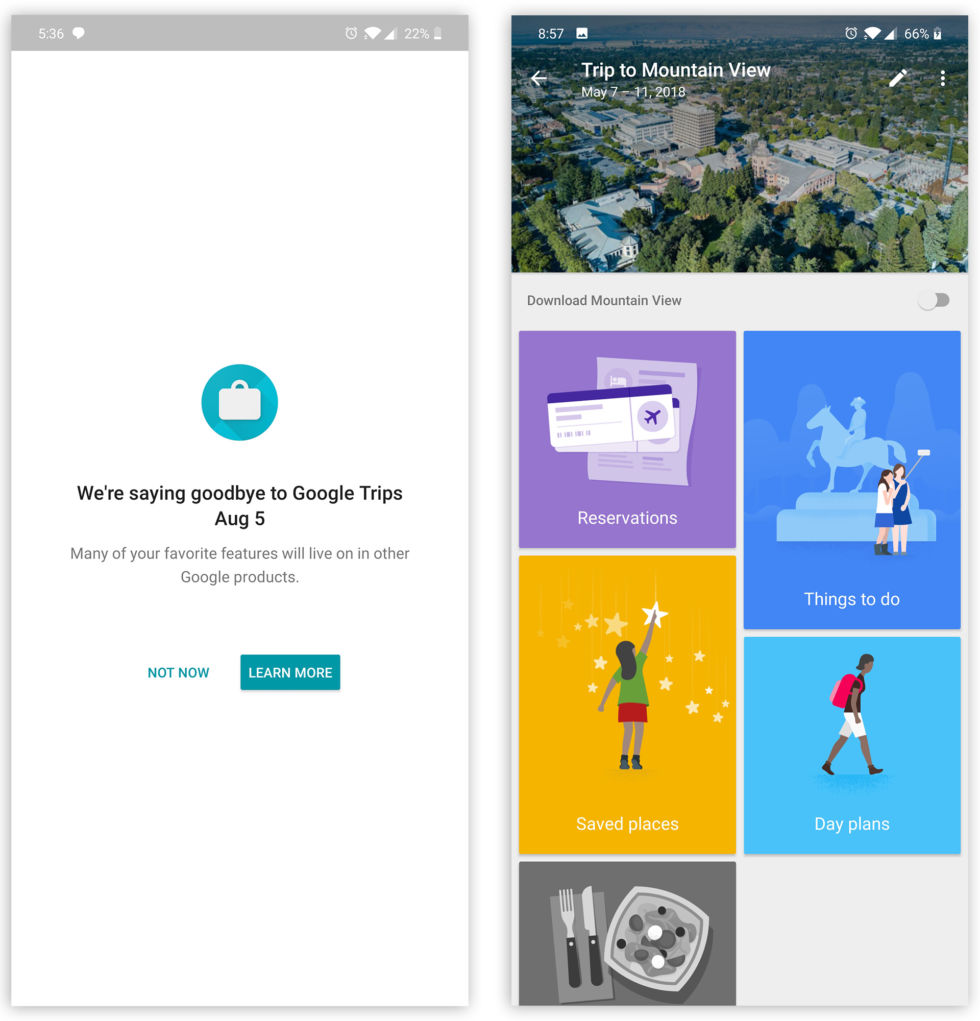 Google’s wild ride of service shutdowns never stops. Next up on the chopping block is Google Trips, a trip organization app that is popular with frequent travelers. Recently Google started notifying users of the pending shutdown directly in the Trips app; a splash screen now pops up before the app starts, saying “We’re saying goodbye to Google Trips Aug 5,” along with a link to a now all-to-familiar Google shutdown support document.