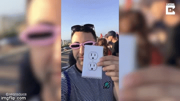 This is a video of a guy with an unusual wearing more than one pair of sunglasses at once fetish using a photorealistic sticker of an electrical outlet to prank people trying to charge their mobile devices. They try to stick their plugs in but it’s just a sticker — LOL. I don’t know about you, but if I ever try to charge my phone and the plug turns out to just be a sticker I’m yelling at anyone with a camera pointed at me. Oh you think this is funny, Back To The Future II?! I needed to call my grandma in the hospital. Now she’s dead and you blew my shot at any inheritance. You owe me a cuckoo clock collection now. That said, I’m totally going to stick one of these fake electrical outlets on the back of my pants and take a lap around the office. “I’ll go get a fork.” *winks*