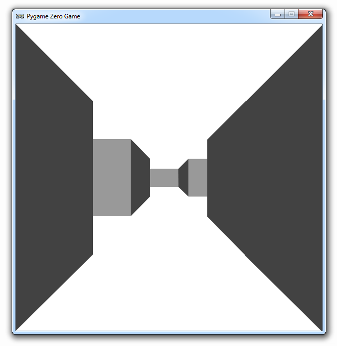 If we draw this out with lines showing the block positions, we get a view that looks like we’re looking down a long corridor with branches leading off left and right. In our Pygame Zero version of the maze, we’re going to use this wireframe as the basis for drawing our block elements. We’ll create graphics for blocks that are near the player, one block away, two, three, and four blocks away. We’ll need to view the blocks from the left-hand side, the right-hand side, and the centre.