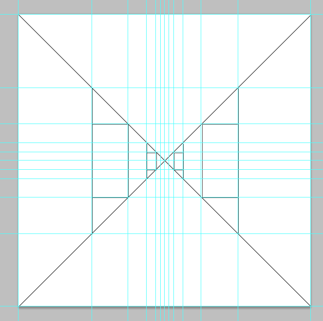 There’s an interesting trick to recreating the original game’s 3D corridor display which, although quite limited, works well for a simplistic rendering of a maze. To do this, we need to draw imaginary lines diagonally from corner to corner in a square viewport: these are our vanishing point perspective guides. Then each corridor block in our view is half the width and half the height of the block nearer to us.