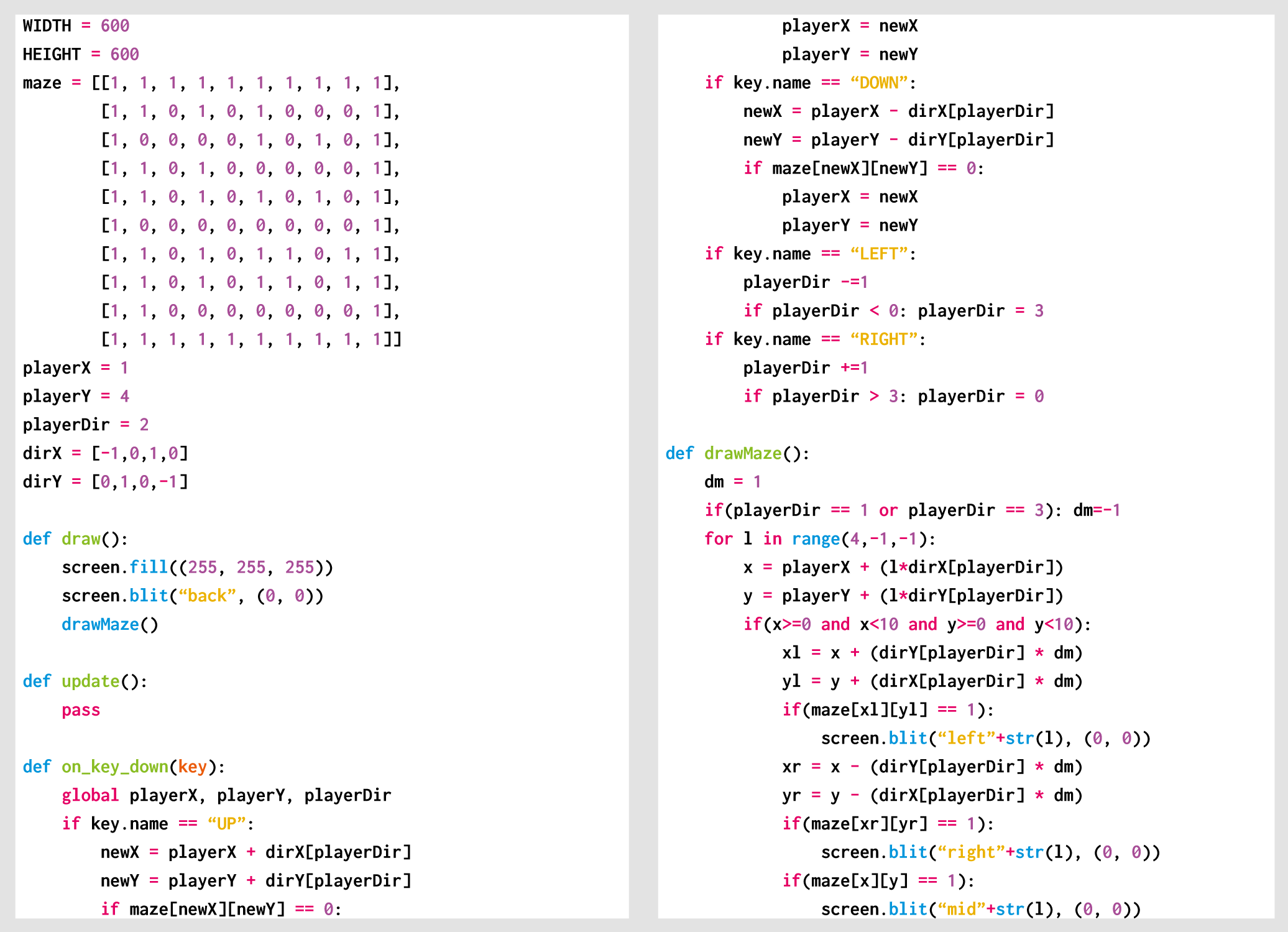 Once we’ve created our block graphics, we’ll need to make some data to represent the layout of the maze. In this example, the maze is built from a 10×10 list of zeros and ones. We’ll set a starting position for the player and the direction they’re facing (0–3), then we’re all set to render a view of the maze from our player’s perspective.