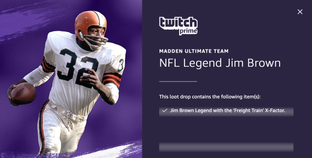 If you’re an Amazon Prime member, you’re entitled to become a Twitch Prime member at no extra cost. And if you’re a Twitch Prime member, you can add the legendary Jim Brown to your Madden 20 Ultimate Team for free.