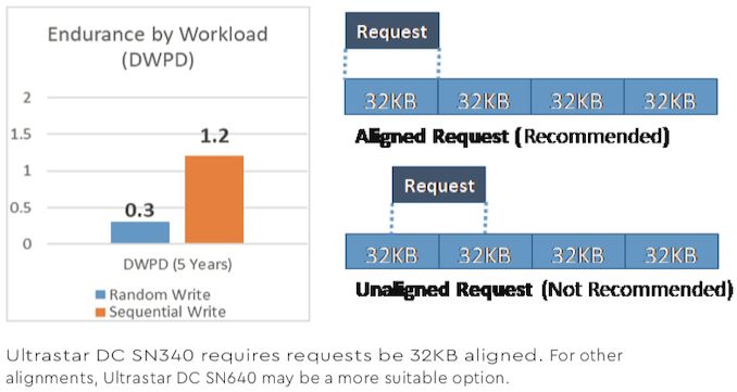 One key thing to note about the Ultrastar DC SN340 is that it requires all requests to be 32 KB aligned to guarantee consistent performance and appropriate endurance, so these drives are not for everyone. This is a result of the drive’s Flash Translation Layer (FTL) managing data with a coarser granularity, which significantly reduces the size of the indirection tables and allows the drive to operate with less DRAM than the usual 1GB per 1TB ratio.