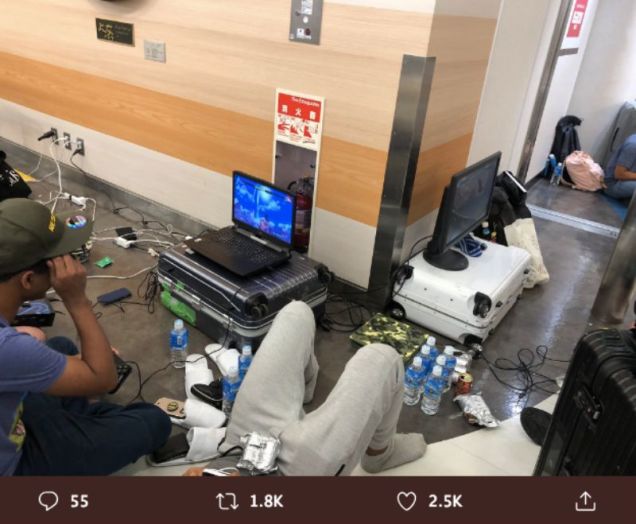 Earlier this week, a typhoon hit Japan. According to reports, nearly seventeen thousand people were stranded at Narita Airport, outside Tokyo. Flights were canceled, and it was difficult to get trains and taxis. Pro fighting game player Naoki “Moke” Nakayama was among those who were stuck.