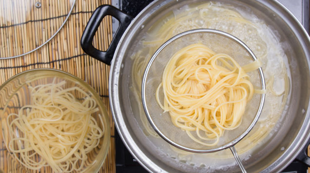 Reheating leftover pasta can be tricky. Splashing it with a bit of water can help loosen things up, but if you really want to revive a clump of stiff, dried-out noodles, you’ll need to save a little bit of your pasta cooking water.