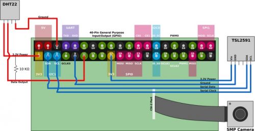 GMpi uses a Raspberry Pi Model 3B+, to which are connected temperature-humidity and light sensors from our friends at Adafruit, as well as a Raspberry Pi Camera Module.