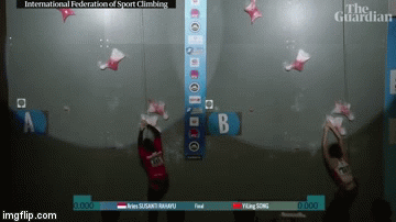 This is a video of Indonesian climber Aries Susanti Rahayu (aka Spiderwoman) setting the new women’s world record for 15-meter speed climb, with a time of 6.995 seconds, beating the previous record set by her competitor in the video, Song Yiling of China, by 0.106 seconds. For reference, I probably couldn’t even run 15-meters in 6.995 seconds. As a matter of fact, I probably couldn’t go that fast under my own power doing anything but tripping and falling off a cliff. FUN FACT: Did you know speed climbing is going to be a new official event in the 2020 Tokyo Olympics? I did not, until I just read it. Fingers crossed they also reconsider my petition to include competitive eating, because I could easily take home the gold in Reese’s Peanut Butter Cups (I’ve been watching Willy Wonka every day and training).