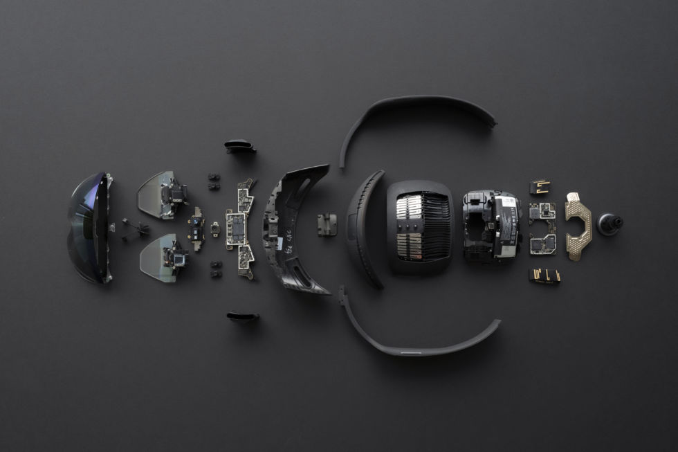 Exploded view of a HoloLens 2 headset. This is not an iFixit teardown, and we do not recommend attempting to reduce your $3,500 AR headset to its component parts. [credit: