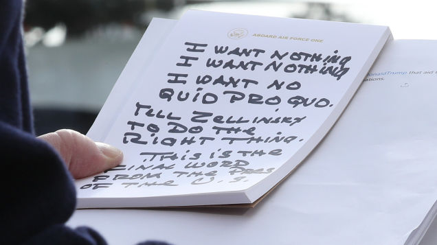 In response to Ambassador Gordon Sondland’s public testimony last week—and growing evidence for a quid pro quo—Trump addressed White House reporters on Wednesday, using a handwritten note on Air Force One letterhead that read like a song written by a heartbroken lover. “I WANT NOTHING I WANT NOTHING,” one page read.…