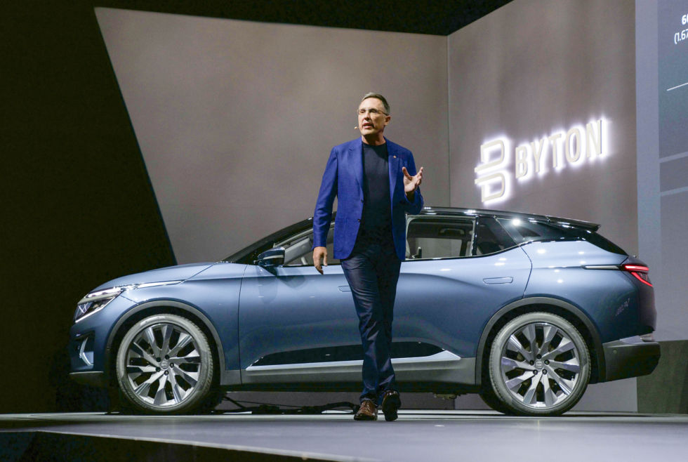 Byton’s CEO Daniel Kirchert on stage with the production M-Byte BEV at CES 2020. [credit:
