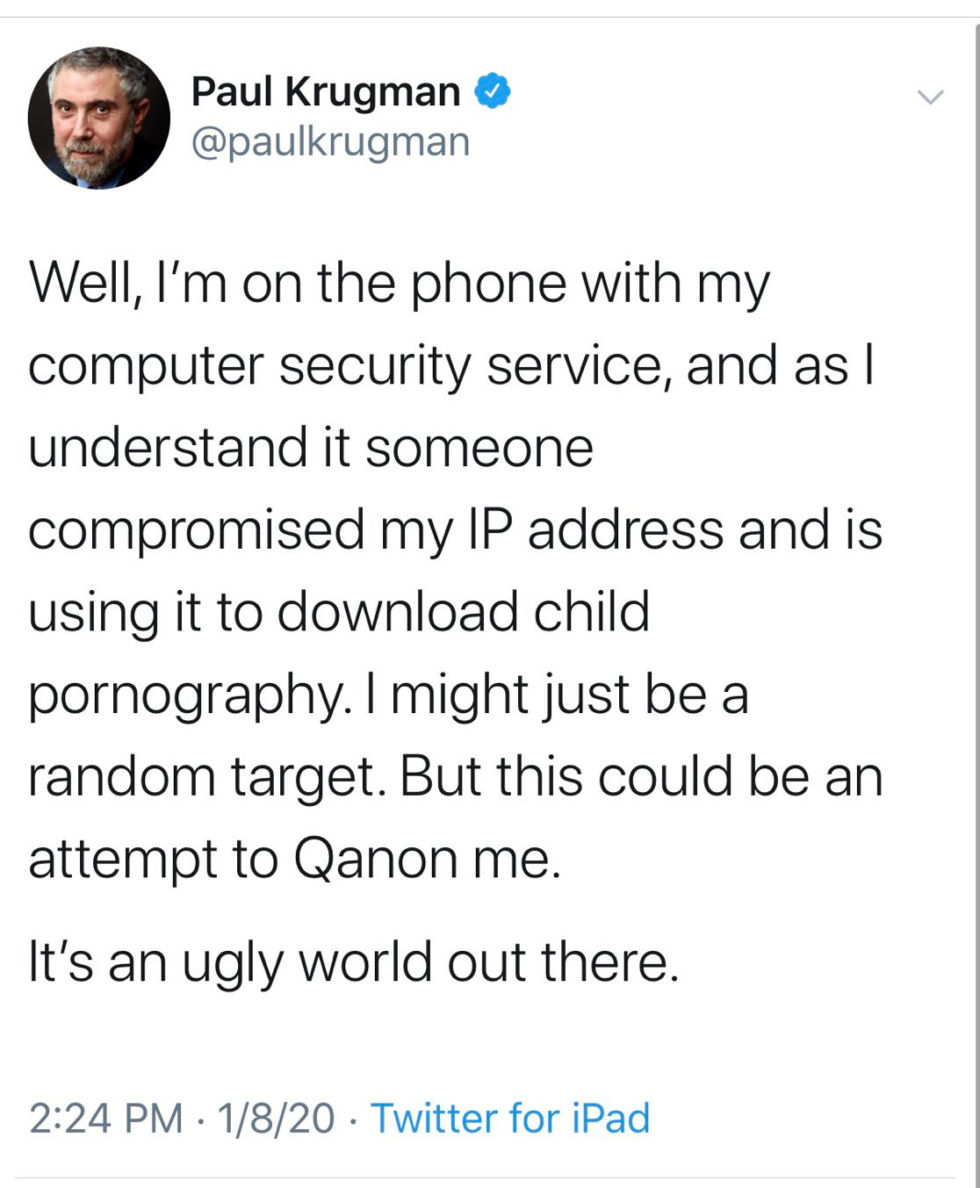 Paul Krugman, the Nobel Prize-winning economist, professor at the City University of New York, and New York Times columnist, experienced a chain of what appear to be Internet scam mishaps based on posts to Twitter that he later deleted. Initially, Krugman claimed to be “on the phone with my computer security service, and as I understand it someone compromised my IP address and is using it to download child pornography.”