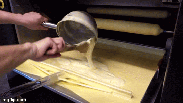 This is a video detailing the process of baking a 23-layer ‘tree ring’ Baumkuchen cake in Korea. The whole process is basically like an automated rotisserie, with a large wooden pin spun in cake batter, then presented to a heating element to bake the thin layer as it rotates, then the process is repeated over and over again until you have 23 delicious layers. Simple enough. Me? *lifting shirt, jiggling belly* I only have one delicious layer. “I think I’m gonna be sick.” Hoho, too much of a good thing, I hear you.