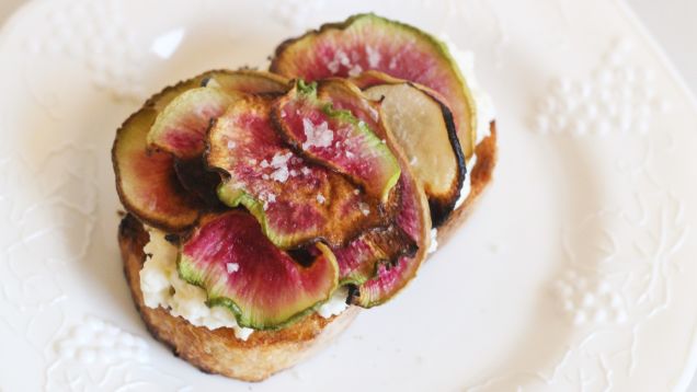 Everyone, at some point or another, has been tempted to eat potpourri (the forbidden chip). The mixture of dried flower petals and spices always looks invitingly crunchy, if a little dusty. You should not eat potpourri, but you should eat these roasted radish slices, which will certainly scratch that itch.