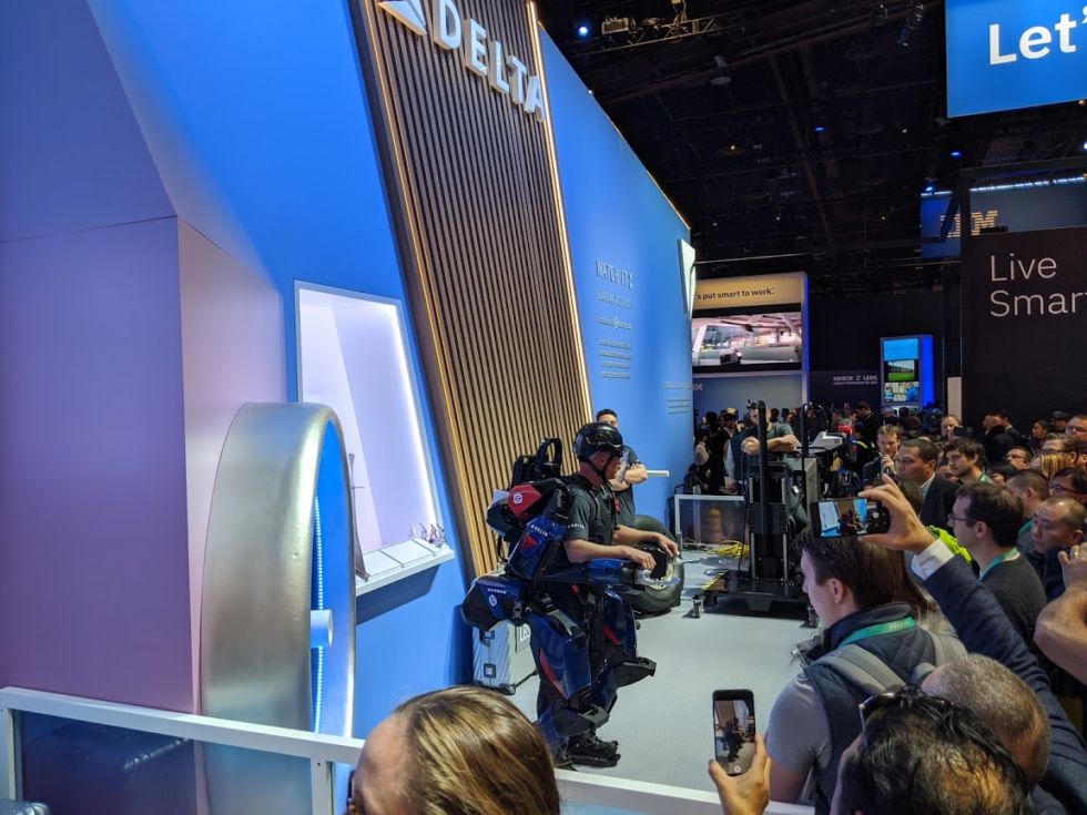 We took this photo of an operator demonstrating movement and work in the Guardian XO at the Delta exhibit at CES. [credit: