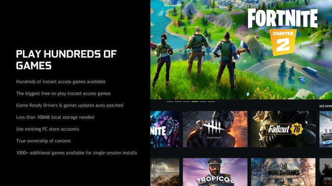 Trying out a number of different strategies over the years in various retoolings, NVIDIA has ultimately settled on an interesting, and for the moment at least, quite unique service offering for their game streaming service. Rather than going with a hybrid subscription model where customers would subscribe to a service, get some games, and get the option of buying more games on that service (ala Google Stadia or Playstation Now), NVIDIA has instead focused purely on providing the infrastructure and streaming services, but not the games. The net result is that GeForce NOW runs on a bring-your-own-games model, where NVIDIA rents out what’s essentially a virtual machine instance on their servers, and gamers can use their Steam/Uplay/Battle.Net/Epic accounts to play games they already own.