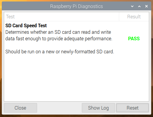 The test takes a minute or so to run on a Raspberry Pi 4 (it’ll take longer on older models), and at the end you’ll see a results screen with either (hopefully) PASS or (if you are less fortunate) FAIL. To see the detailed results of the speed test, press “Show Log”, which will open the test log file in a text editor. (The log file is also written to your home directory as rpdiags.txt.)