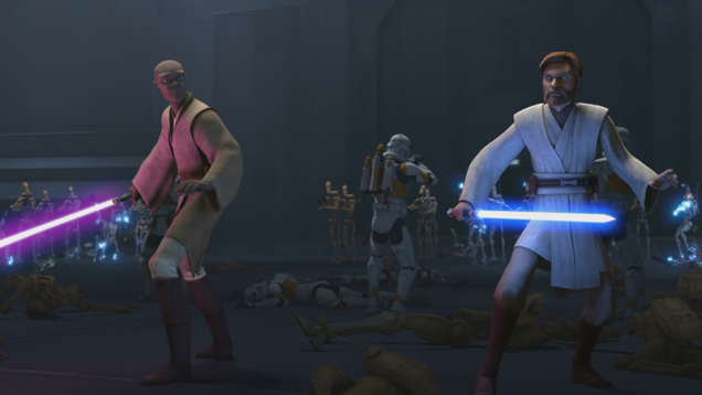 There’s a moment in this week’s Star Wars: The Clone Wars where Mace Windu dramatically leaps into a facility packed with battle droids. His lightsaber raised, he offers an ultimatum: He has destroyed thousands of their ilk, so they can stand down and be reprogrammed by the Republic or join those thousands. They…