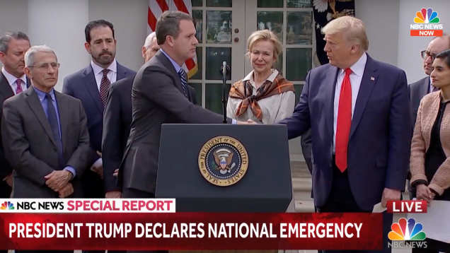 Donald Trump announced a national emergency over the outbreak of the novel coronavirus spreading across the country on Friday, for some reason bringing along the CEOs of some of America’s largest companies to trot up to the podium and explain the merits of public-private partnerships that they’ve formed with the feds.