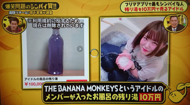 In January 2019, pop group the Banana Monkeys offered their bath water for 100,000 yen ($930) online. It went under the listing “Leftover hot water from an idol bath,” and two members of the group appeared in a YouTube clip, fully clothed in the tub. Member Tenka no Chanyuki says this wasn’t the group’s idea and that…