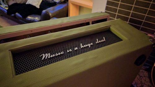 The enclosure is all custom-designed and built using scrap wood wrapped in green faux leather material. Ben sourced most of the other materials — rubber feet, hinges, switches, metal grille — on Amazon.