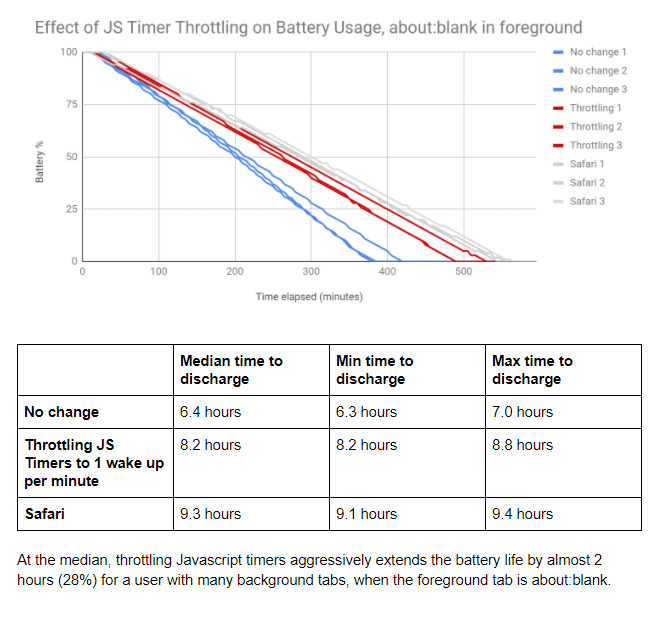 The flag in Canary links to a load of documentation detailing Google’s test runs with this new feature. For the first test, the company grabbed a 2018 15-inch Macbook Pro and loaded up 36 background tabs with a blank foreground tab, then let the laptop run until it died. With throttling on, the laptop lasted two hours longer, or 28 percent longer, than the default settings. That’s a huge improvement, but it still can’t get Chrome up to the level of Apple’s Safari, which bested Chrome by three hours with the default settings and by one hour with the new throttling flag.