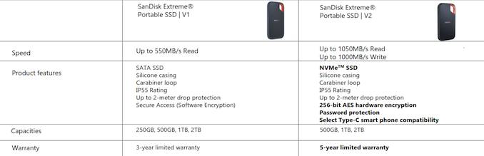 Both of the drives being introduced today have an operating temperature range of 0 to 45C, and come with an IP55 ingress protection rating. The drives are also getting hardware encryption support, which brings them on par with the WD My Passport SSD as far as security is concerned. Western Digital also indicated that their confidence in BiCS 4 flash is allowing them to upgrade the warranty on the SanDisk Extreme model from the usual 3 years to 5 years. On the pricing front, the USB 3.2 Gen 2×2 Extreme PRO Portable SSD v2 is priced at $300 and $500 for the 1TB and 2TB versions. The Extreme Portable SSD v2 has a suggested retail price of $120, $200, and $355 for the 500GB, 1TB, and 2TB versions respectively.