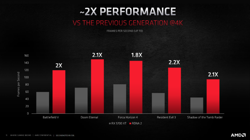 Big Navi offers huge generation-on-generation gains… much like Nvidia’s RTX 3000 series did, versus its RTX 2000 series. [credit: