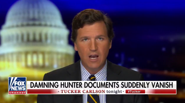 Fox News host Tucker Carlson devoted a segment of his show on Wednesday night to damning documents supposedly proving corruption by Democratic nominee Joe Biden—except they had mysteriously vanished in transit.