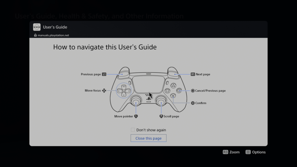 If you visit that address from a standard PC or mobile Web browser, the site gives an error message. But if you access it from the PS5 menu, you see a picture explaining “how to navigate this user’s guide” with the DualSense controller, as seen above.
