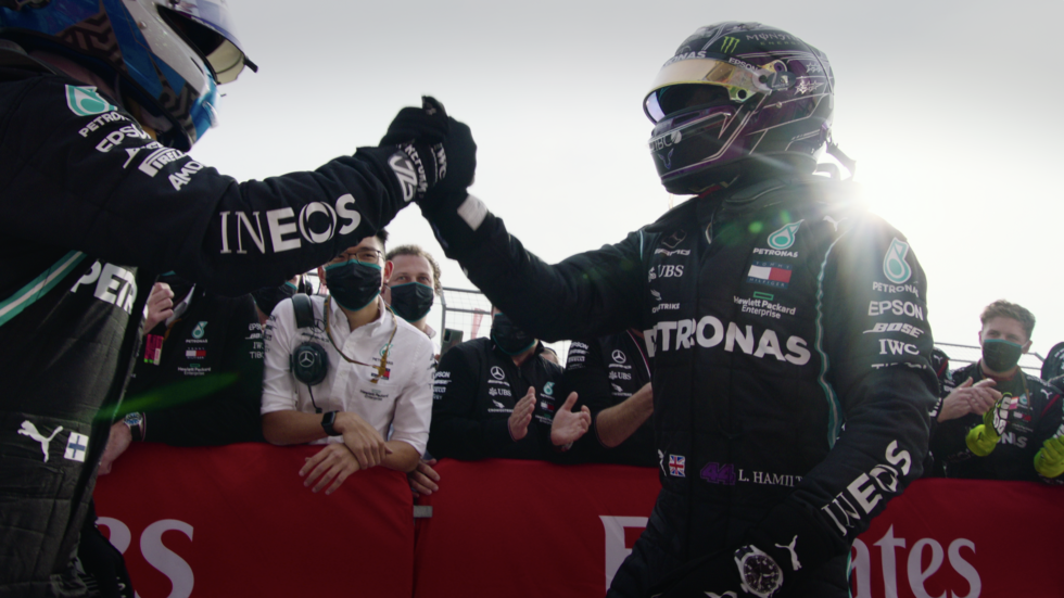 Valtteri Bottas (L) and Lewis Hamilton (R) shake hands after a race. Bottas gets far more screen time than his teammate, who only broke a number of long-standing F1 records in 2020. It’s an odd omission by Netflix. [credit:
